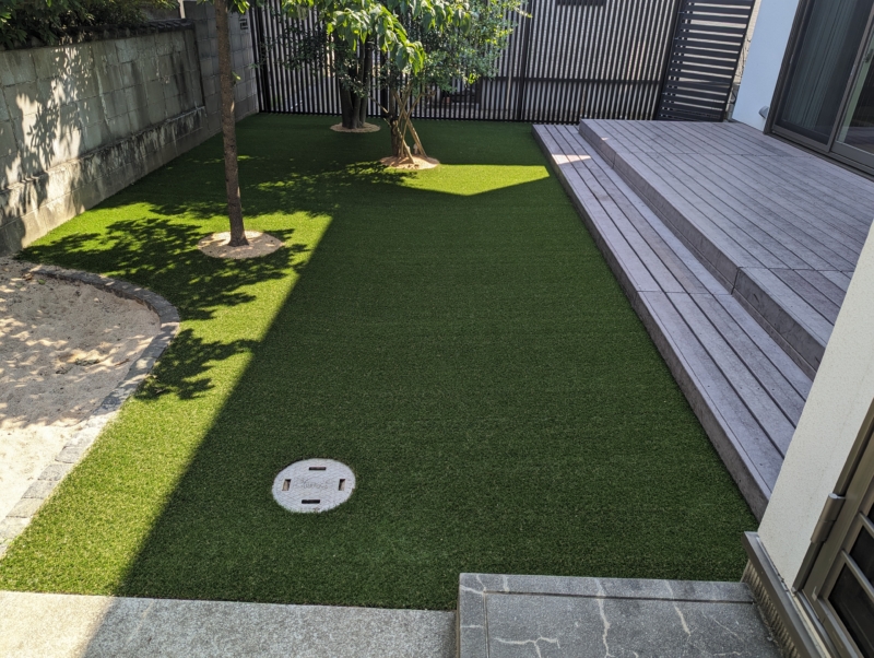 お庭の地面を人工芝に変えて、 愛犬と快適に暮らす生活を手にいれます。